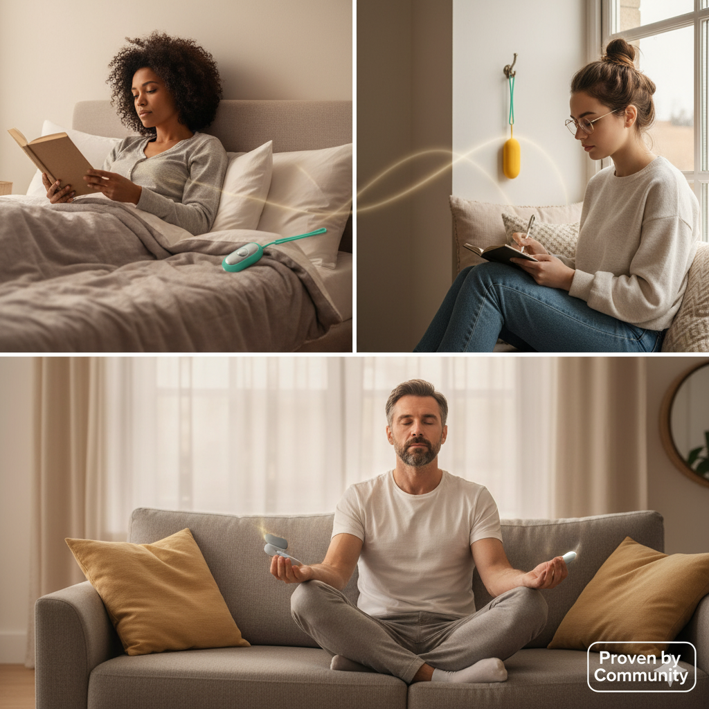 A: Unlike apps that require active participation or audio that can disturb sleep, DreamPulse uses gentle micro-pulses that physically calm your nervous system—working even when your mind can't focus. It's hands-free, silent, and scientifically designed to trigger your body's natural relaxation response.