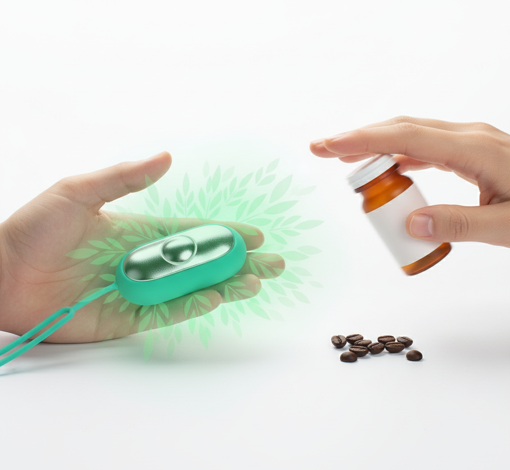 The device uses low-frequency pulse therapy to stimulate the Neiguan point on your wrist, which directly communicates with your nervous system to reduce the "fight or flight" response.