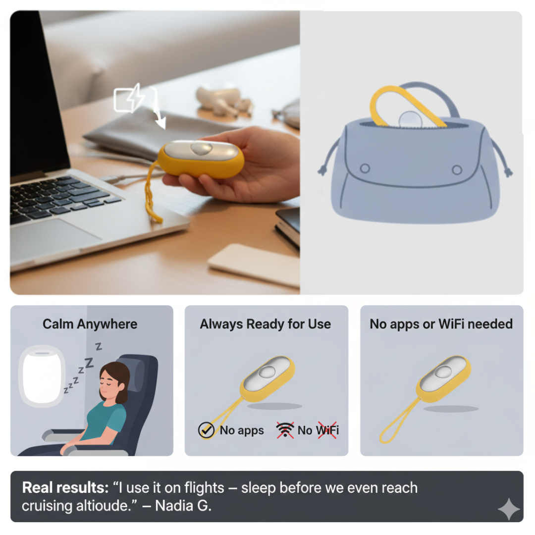 Real results: "As a consultant who travels weekly, this has been a game-changer. I used to arrive at clients exhausted and jetlagged. Now I sleep on every flight and show up refreshed." – Nadia G., Frequent Traveller