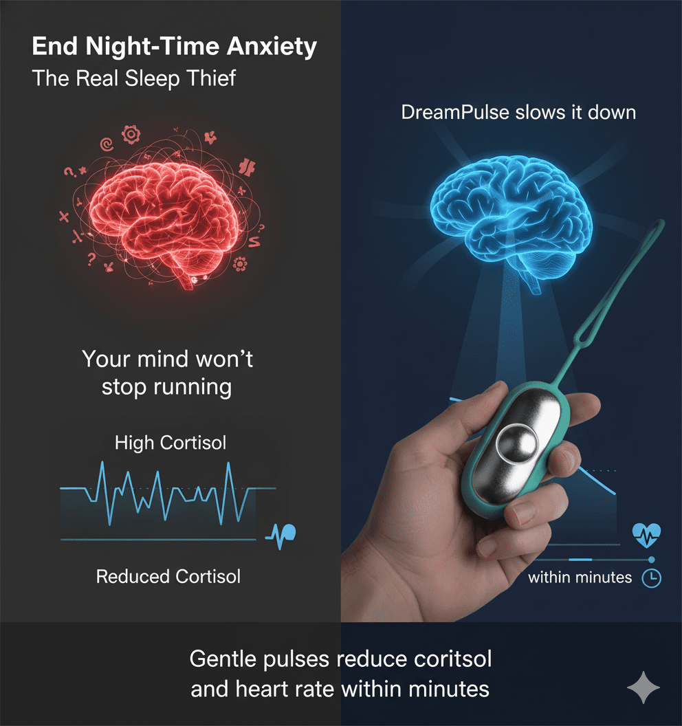 The moment your head hits the pillow, your mind starts racing: tomorrow's meeting, unpaid bills, that awkward conversation from last week. DreamPulse breaks that cycle—gently signaling your nervous system that it's safe to let go.